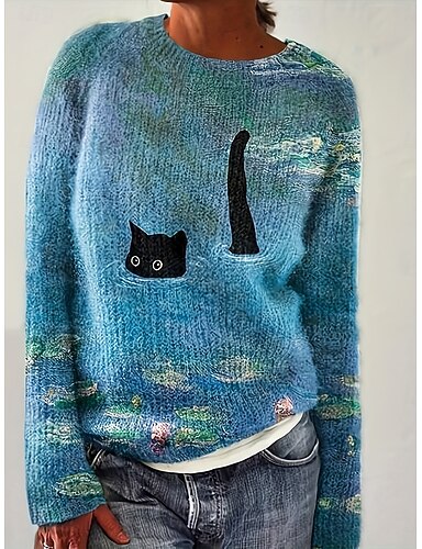 Жен. Вязаная ткань На каждый день Мягкий Животное Рельефный узор Вырез под горло Трикотаж С принтом Длинный рукав Обычные топы Вязать на открытом воздухе Повседневные выходные Синий Зеленый Осень Зима