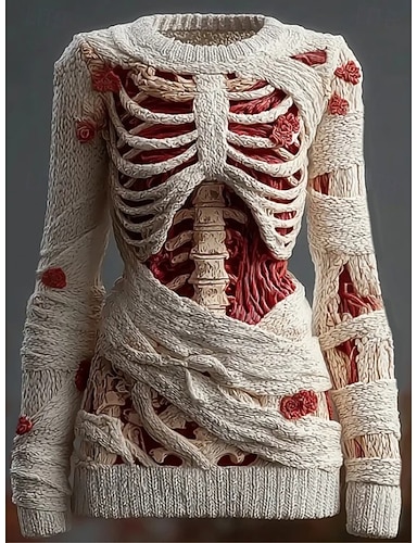 Свитер для женщин на Хэллоуин с скелетом Милый уличный стиль Повседневный графический рисунок Скелет Круглый вырез Патчворк Вязаный Длинный рукав Обычные топы Вязание красный бежевый Осень Зима