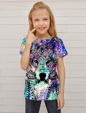 Девочки 3D Животное Галактика Волк Футболка С короткими рукавами 3D печать Лето Весна Активный Мода Симпатичные Стиль Полиэстер Дети 3-12 лет на открытом воздухе Повседневные Стандартный