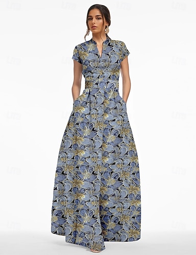 Жаккардовая Brocade Цветочная платье А-силуэта матери невесты вечернее элегантное платье формальное свадебное гостевое длины пола с короткими рукавами V-образным вырезом карманами нейлон с разрезом