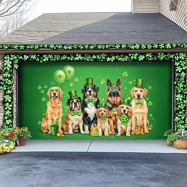 Накидка на гаражные ворота ко Дню Святого Патрика, очаровательные собачки в шапках лепреконов с клевером, праздничное украшение для улицы к празднованию Дня Святого Патрика.#10661292