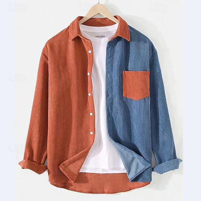 Муж. Рубашка Повседневная рубашка Вельветовая рубашка Кнопка рубашка Синий Оранжевый Длинный рукав Контрастных цветов Лацкан Повседневные на открытом воздухе Карман Одежда #10886513