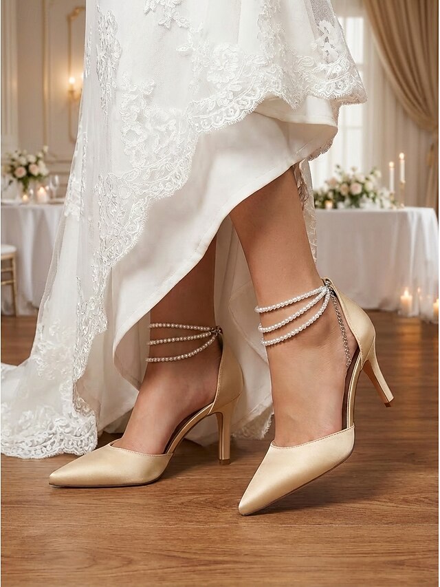 Женские серебристые атласные туфли на каблуке с острым носком и жемчужными ремешками на щиколотке, элегантные свадебные туфли для пляжной свадьбы.#11182108