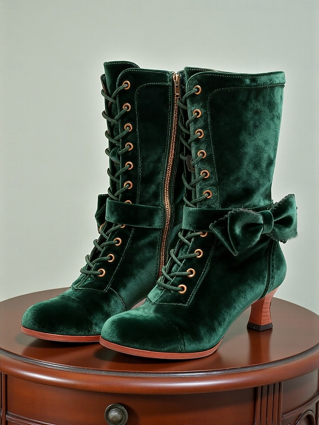 Женские зеленые бархатные ботинки на шнуровке с бантом и молнией — элегантный викторианский стиль 1920-х годов, идеально подходят для официальных мероприятий, зимней моды и любителей винтажной одежды. #11240865