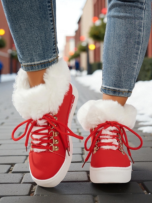 женские красные кеды из искусственного меха — тёплая зимняя обувь на шнуровке с мягкой подкладкой, повседневная рождественская обувь для отдыха на природе и уличного стиля #11949349