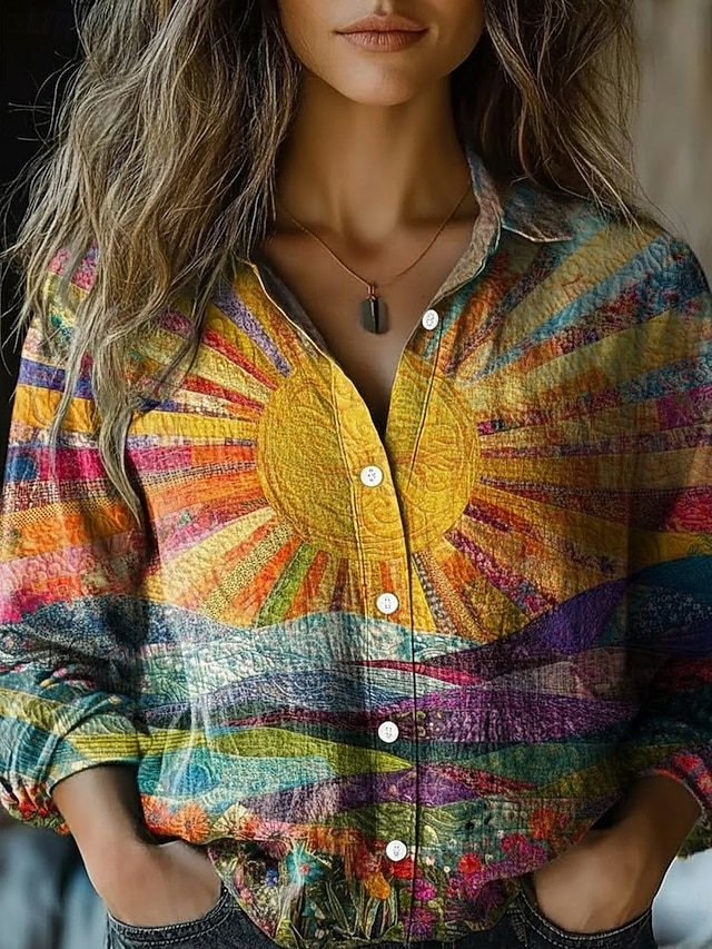 Ткань:Полиэстер,Стиль топа:Искусственный хлопок и лен,Рубашка,Пол:Жен.,Назначение:Повседневные,Праздники,Дизайн:С принтом,Пуговицы,Стиль:Стиль,Богемия,На каждый день,Винтаж,Категория:Рубашка,Тип посадки:Стандартный,Тип выреза:Рубашечный воротник,Длина рукава:Длинный рукав,Эластичность ткани:Неэластичная,Правила ухода:Влажная чистка,Ручная стирка,Машинная стирка,Длина топа:Обычные топы,Узор:Загар и защита от солнца,Сезон:Осень,Весна,