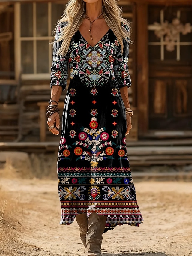 Женское макси-платье Boho Платье-обтягиватель Вечеринка Повседневное Ежедневная Встреча На выход Обычная посадка Графический Геометрический Пейсли Длинный рукав V-образный вырез Синий Черный #12443364