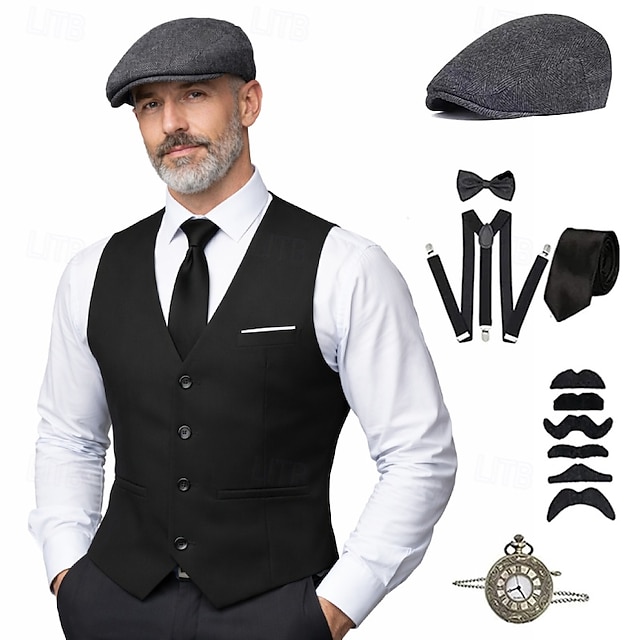 Бурные 20-е 1920-е годы Ретро Инвентарь Жилет Набор аксессуаров барин Гангстер Маскарадный костюм Муж. Карнавальный костюм 8 ед. Рождество Хэллоуин Карнавал