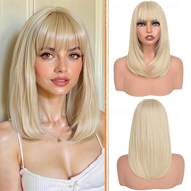 Парики из светлых волос боб с челкой, длиной до плеч, прямые, естественно выглядящие, синтетические, термостойкие, средние, для женщин, на каждый день, для вечеринок, 16 дюймов, платиновый блонд #12604424