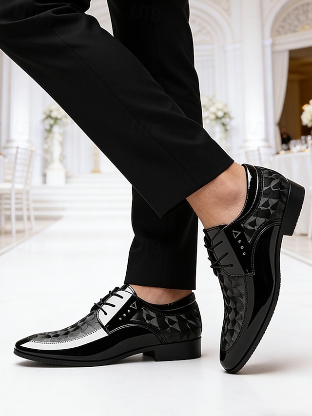 Мужские черные лакированные туфли из искусственной кожи, глянцевый верх, шнуровка, элегантный стиль для свадеб, приемов и вечерних мероприятий. #13664083