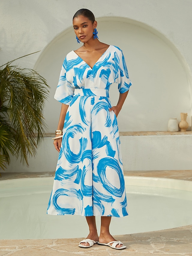 атласное синее платье макси с принтом мазков кисти для повседневного отпуска и путешествий #14592114