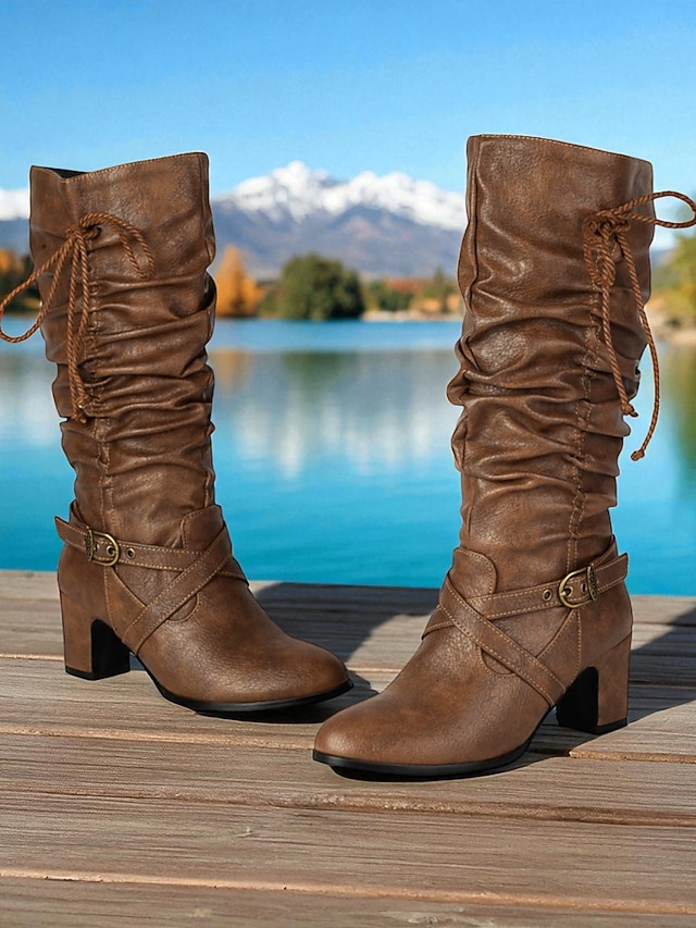 Женские коричневые сапоги из искусственной кожи с застежкой-молнией сбоку и ремешком с пряжкой, винтажные повседневные сапоги на блочном каблуке для осени, зимы, улицы и повседневной носки #15447897