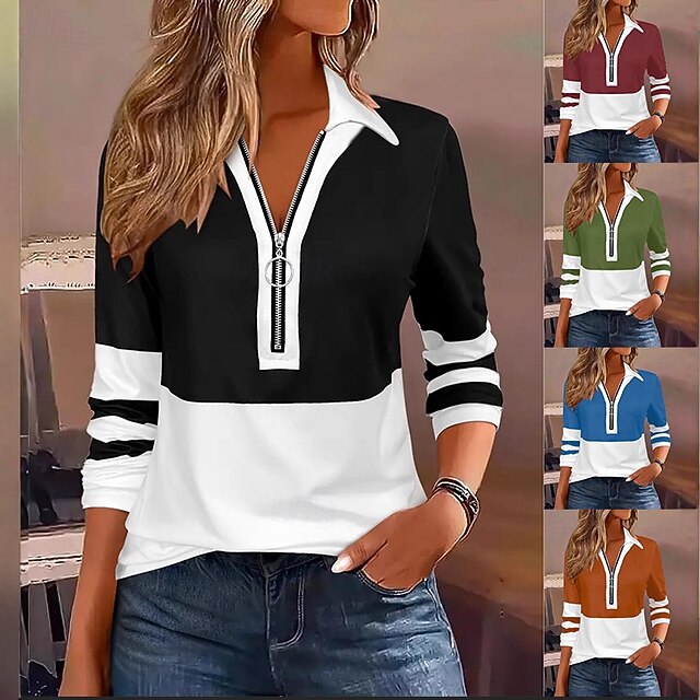 Жен. Туника Четверть молния Сплошной цвет Контрастных цветов Элегантный стиль Винтаж Стиль Длинный рукав Вырез под горло Обычные топы Повседневные Синий Черный Винный Коричневый Зеленый Весна Осень #15492764