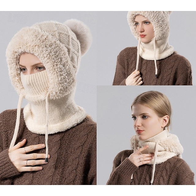 Зимняя вязаная шапка-бини 3-в-1 с флисовой подкладкой для женщин со встроенной маской для лица и утеплителем для шеи, теплая и уютная шапка для холодной погоды на открытом воздухе#15563594