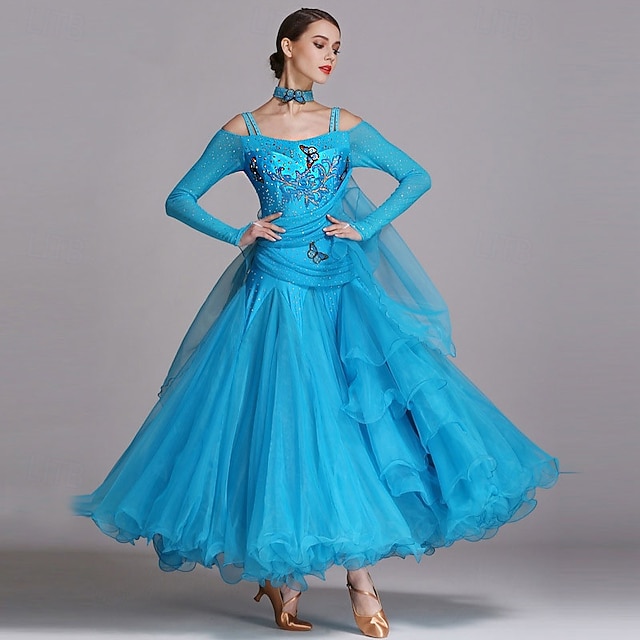 Женское платье для бальных танцев, вышитое стразами, с бабочкой, многослойное фатиновое, элегантное, для соревнований по вальсу, танго, фокстроту – небесно-голубое #15909227