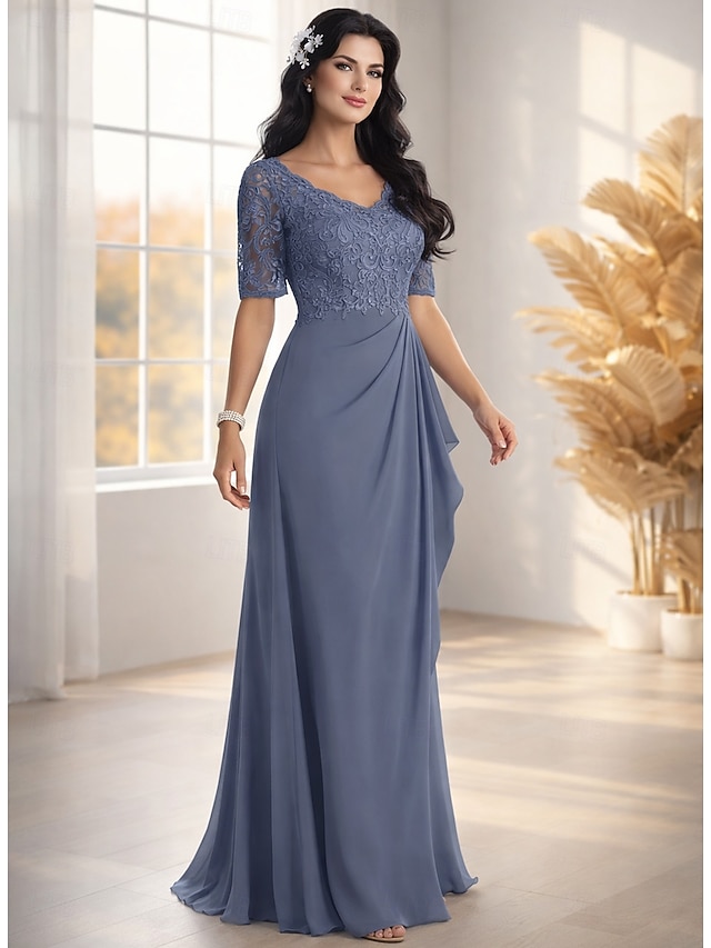 А-силуэт В пол Свадебное платье для гостей Вечернее платье Платье для матери невесты Рукав до локтя V-образный вырез Элегантный стиль Свадебный гость Помолвка Шифон с Плиссировка Аппликации #16195039