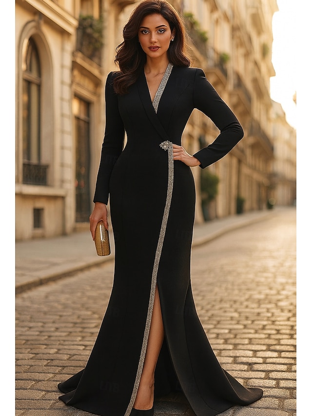 Жен. Платье-смокинг Русалка Свадьба Официальные Свадебный гость Эластичная ткань в 4 направлениях Элегантный стиль Блестящая Длинный рукав В пол V-образный вырез Однобортный крой #17238647
