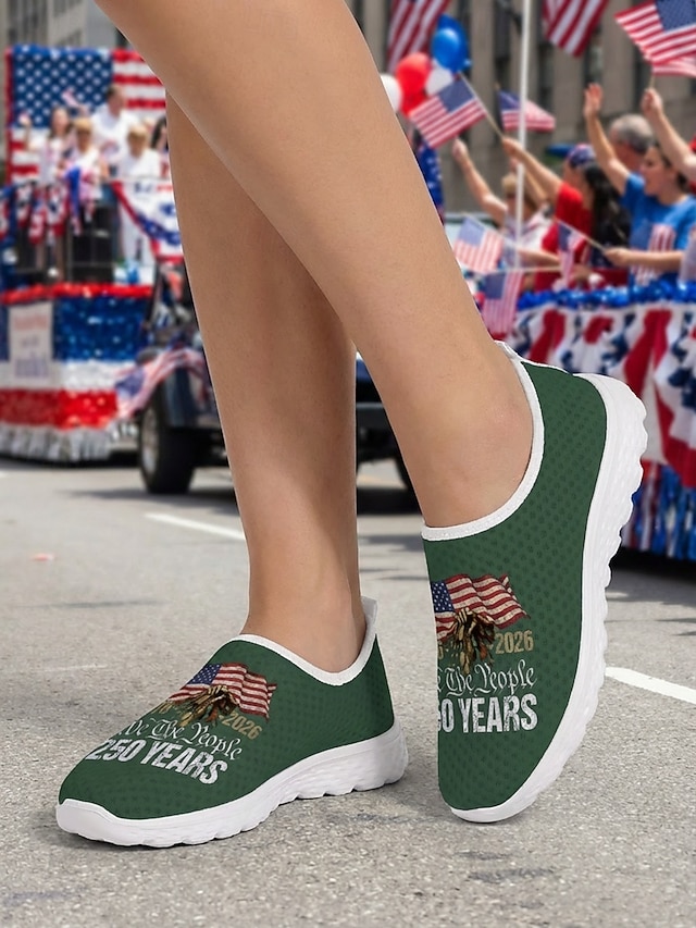 Женские патриотические слипоны — удобные и дышащие сетчатые зеленые туфли с изображением американского флага для парадов, Дня независимости 4 июля, 250-летия США и национальных торжеств. #17698943