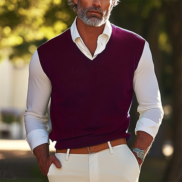 Муж. Свитер жилет Платье-свитер Шерстяной свитер Пуловер Свитер Вязать Трикотаж Сплошной цвет V-образный вырез Стиль Старинный Снова в школу! Одежда Весна Осень Винный Черный S M L #17900553