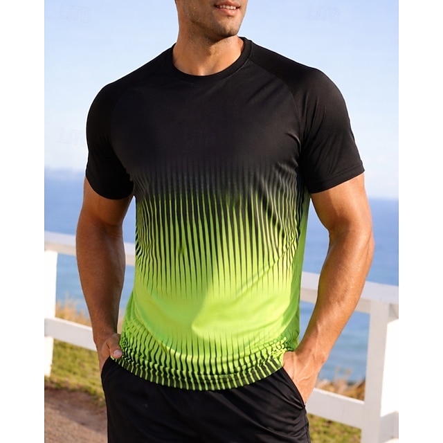 Пол:Муж.,Категория:Спортивный топ,Спортивная рубашка,Футболка для бега,Компрессионная футболка,Тип:Верхняя часть,Футболка Футболка,Вид деятельности:Прогулки,Бег,Тренировка в тренажерном зале,Назначение:Тренажерные залы,на открытом воздухе,Повседневные,Спорт,Сезон:Лето,Тип посадки:Стандартный,Эластичность ткани:Слабоэластичная,Функция:Быстровысыхающий,Влагоотводящие,Дышащий,Ткань:Полиэстер,Длина рукава:С короткими рукавами,Тип выреза:Вырез под горло,Узор:Полоски,Градиент,Правила ухода:Влажная чистка,Влажные и сухие,В комплекте:Футболка,