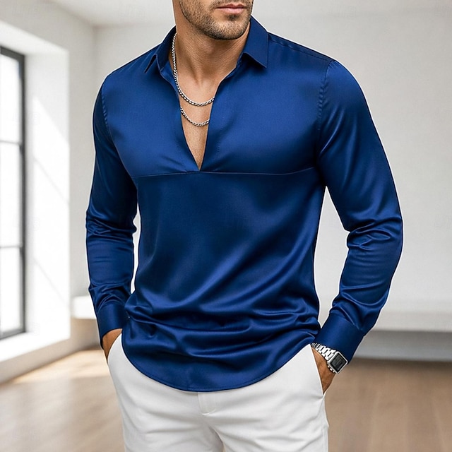 Муж. Рубашка Атласная рубашка Повседневная рубашка Кнопка рубашка Выпускная рубашка Pullover Полотняное плетение Для вечеринок Свадьба Черный Темно синий Длинный рукав V-образный вырез #18431736