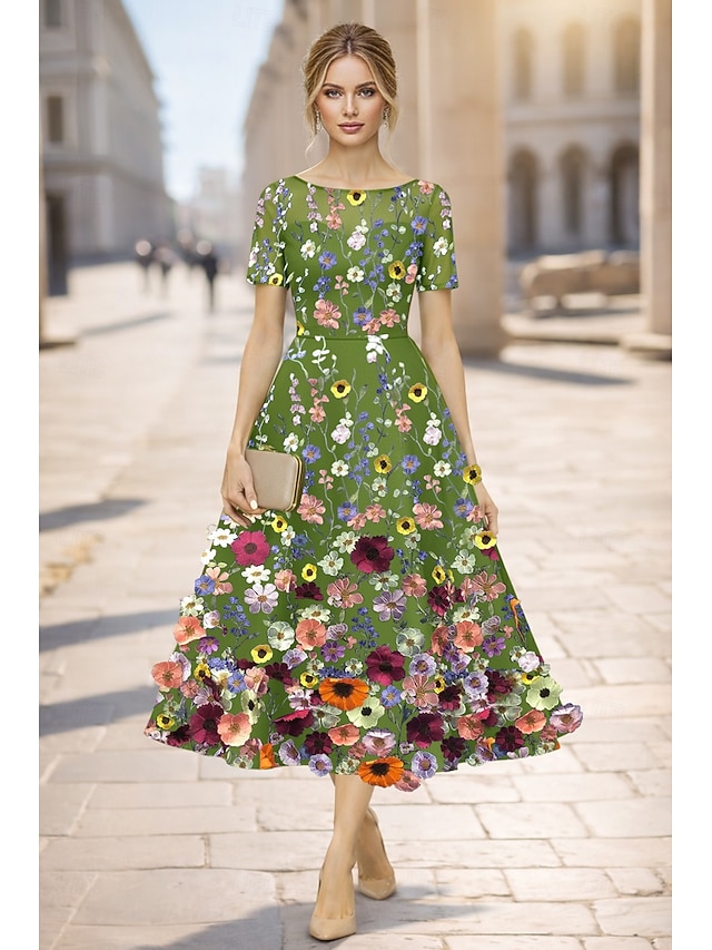 А-силуэт До щиколотки Ниже колена коктейльные платья Элегантный стиль С цветами С короткими рукавами Вырез лодочкой Свадьба Официальные Кружева с Вышивка Аппликации #18908089