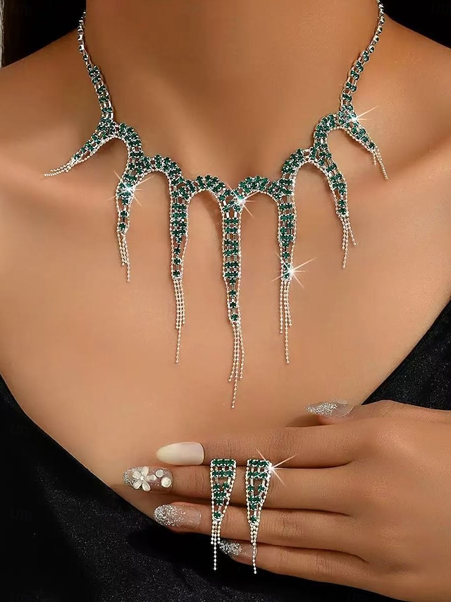 Женский комплект украшений со стразами зеленого цвета, включающий ожерелье и кольца для рождественской вечеринки, бала &вечерние мероприятия#19649144