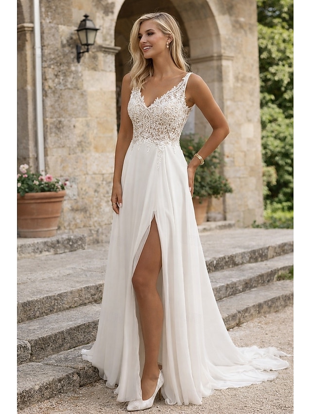 Свадебные Платья На Пляже L-образной Формы V Вырез Без Рукавов Длинного Пола Шифон Невесты С Аппликациями Разрез Спереди #8917014