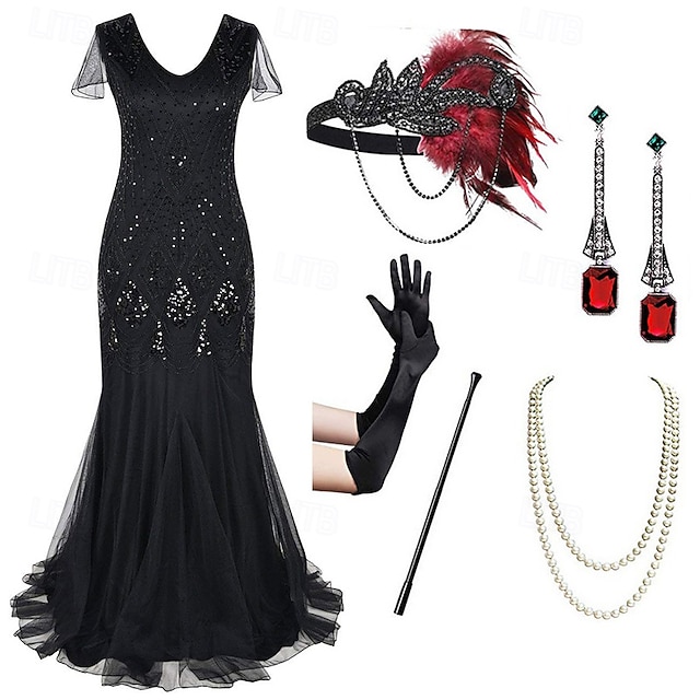 [Ткань и материал] Это винтажное платье в стиле флаппер изготовлено из высококачественного полиэстера, что обеспечивает комфорт при носке и аутентичную эстетику 1920-х годов. Материал красиво сверкает при свете благодаря своим сложным блестящим украшениям, которые добавляют искренность и элегантность ансамблю. [Силуэт и посадка] Платье имеет привлекательный, облягающий силуэт, который изящно расширяется в свободную нижнюю юбку. Этот дизайн подчеркивает естественные изгибы тела, придавая утонченный и вечный шарм, идеально подходящий для вечерних мероприятий или тематических случаев. [Дизайнерские акценты] Платье украшено ослепительными блестящими узорами на лифе, отражающими гламур свингующих двадцатых. Сопутствующие аксессуары включают красное перо и черную блестящую головной убор, а также длинные черные атласные перчатки, которые добавляют штрих классической элегантности. Безопасный жемчужный ожерелье с двойной цепочкой и длинные висячие серьги с акцентами красного драгоценного камня придают дополнительную винтажную привлекательность, в то время как стильный черный сигаретный держатель завершает ретро-образ. [События] Идеально подходит для тематических вечеринок, вечерних выходов, свадебных приемов и девичников, этот комплект платья в стиле флаппер захватывает дух эпохи "Великого Гэтсби". Оно идеально подойдет каждому, кто хочет сделать заявление на любом особом событии, предлагая как утонченность, так и стиль. [Размерный ряд] Доступно в размерах S, M, L, XL и XXL, это одеяние соответствует различным типам телосложения, позволяя каждому носителю достичь идеальной посадки и без усилий воплотить гламур 1920-х годов.