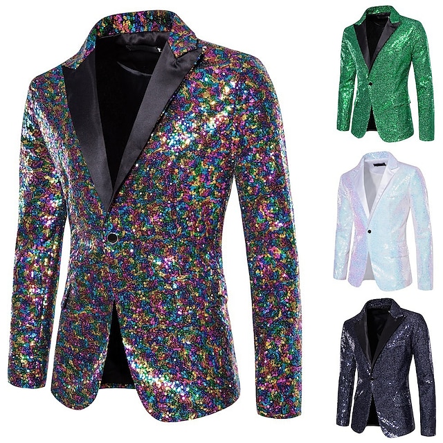 Муж. Блейзер Выступление Вечеринка / коктейль Бальные танцы Винтаж В стиле 1980-х Лето Весна Полиэстер Пайетки Сплошной цвет Однобортный с 1 пуговицей Блейзер Серебряный Белый Темно-синий Зеленый #9625062