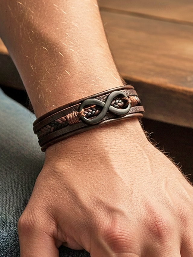 Мужской браслет в виде знака бесконечности из искусственной кожи и сплава, многослойная плетеная конструкция, винтажный стиль, различные цветовые варианты, идеально подходит для отдыха и повседневной носки.#9801385