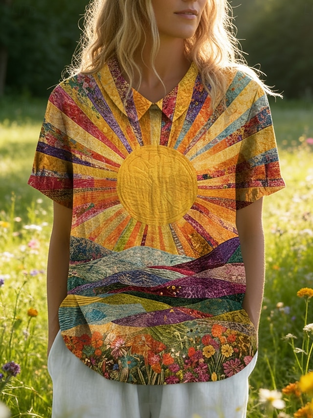 женская блузка пуговицы принт графический рисунок солнце отпуск повседневная повседневная короткий рукав текстурированная ткань рубашка воротник обычный топы повседневный отдых выход на улицу#9814352