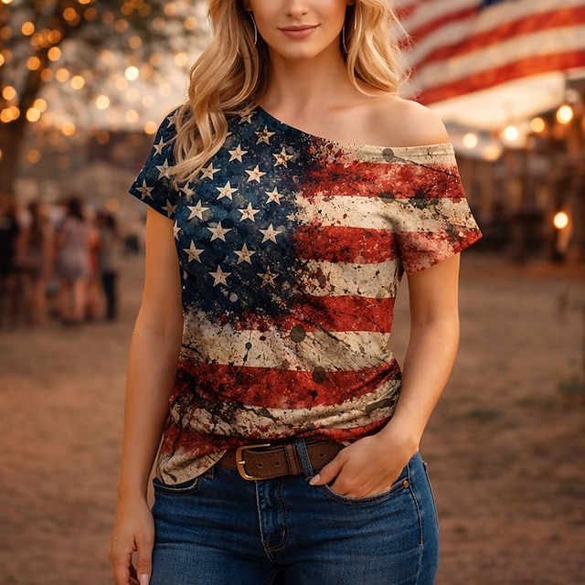 250-летие США Ретро В стиле 1980-х Короткий Как у футболки На одно плечо Короткие рукава Флаг США Маскарадный костюм Жен. 4 июля День независимости Взрослые Футболка#9823635
