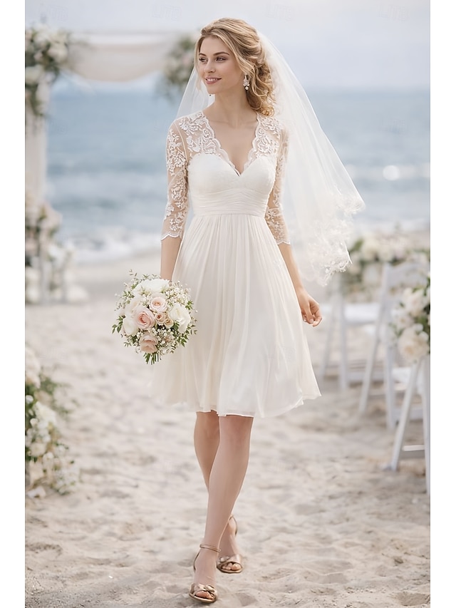 А-силуэт До колена Свадебные платья Платья для свадебного душа Свадебное платье Открытая спина Маленькие белые платья Рукав 3/4 V-образный вырез градация День рождения Шифон Кружева с Рюши