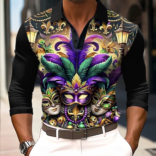 Карнавал Муж. Маски Поло Длинный рукав Футболки поло Рубашки с воротником Винтаж Фестивальный наряд 3D печать Весна Осень Зима Черный #11521010