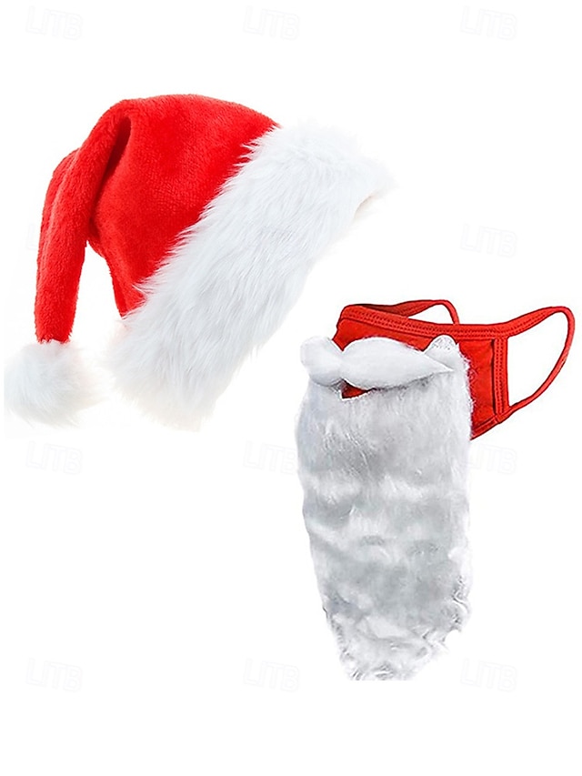 Мужской рождественский комплект из шапки Санты и маски с бородой, красная плюшевая шапка с белым мехом, удобная маска для лица, аксессуар для праздничного костюма для рождественских вечеринок и праздничных мероприятий#14388428