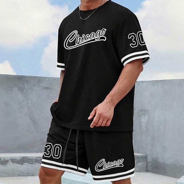 Муж. Текст / Количество 2шт Наборы футболок Летние вершины С короткими рукавами Короткие штаны Вырез под горло Спорт На каждый день на открытом воздухе спорт Повседневные 3D печать Лето Черный #14468690