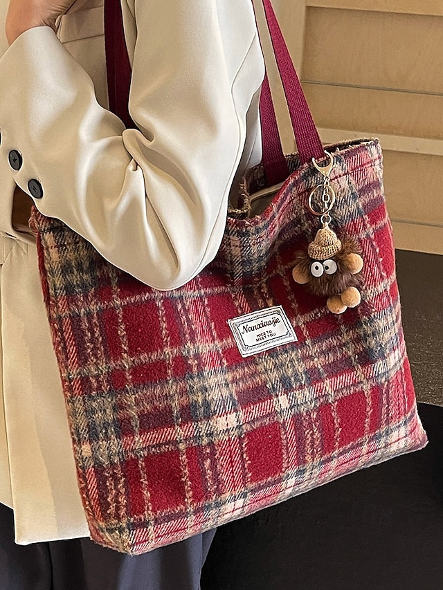 Женские рождественские клетчатые сумки-шопперы – большие и маленькие размеры, полиэстеровая ткань с помпонами, праздничный стиль для предпраздничного шопинга и подарков #13972427