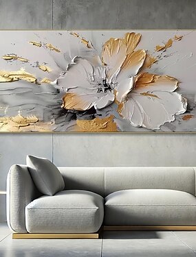 Картина маслом на холсте ручной работы с золотым цветком, абстрактная картина с белыми цветами, декор для гостиной, домашний декор, рулонная картина без рамы, нерастянутая