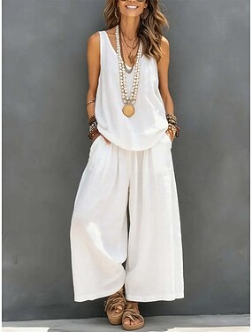 Жен. Комплекты хлопкового льна Комплекты брюк Без рукавов V-образный вырез Сплошной цвет Элегантный стиль Мода Уличный стиль Повседневные на открытом воздухе Синий Белый Коричневый Лето Стандартный