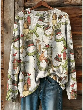 Жен. Вязаная ткань Пуловер Повседневные На каждый день Графика Снеговик Рельефный узор Вырез под горло Трикотаж С принтом Длинный рукав Обычные топы Вязать на открытом воздухе выходные Белый