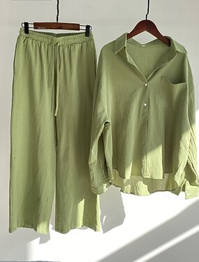 женский хлопковый комплект, брюки, 100% хлопок, рубашка с длинным рукавом и воротником, однотонный, элегантный, модный, уличная одежда, повседневный, для активного отдыха, армейский зеленый,