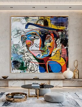 Картина маслом, выполненная вручную, абстрактный портрет, смелое сочетание цветов, современное экспрессионистское искусство, яркая палитра, контраст, синий, желтый, красный, выразительные мазки