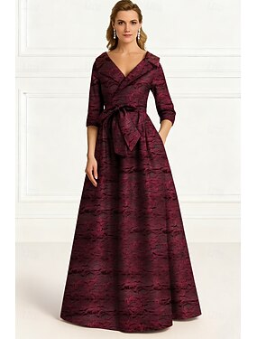 А-силуэт В пол Вечернее платье Платье-клеш Рукав 3/4 Рубашечный воротник Элегантный стиль Простой минималист Официальные Свадебный гость Сатин Платье для матери невесты с Бант(ы)