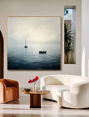 Туманный горизонт с парусниками, картина на морскую тематику, настенное искусство, спокойный океанский пейзаж, винтажный морской декор, картина с парусниками.