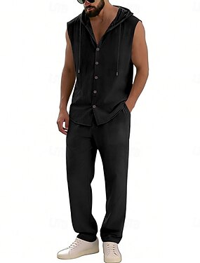 Муж. Льняная рубашка 2 предмета Комплект рубашки А также Льняные брюки Штаны Повседневные брюки Установлен Полотняное плетение Повседневные на открытом воздухе Отпуск Капюшон Без рукавов Лето Весна