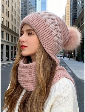 Женский зимний вязаный комплект из шапки и шарфа с помпоном, флисовой подкладкой, 2-в-1: шапка и утеплитель для шеи, уютный и теплый аксессуар для отдыха на открытом воздухе в холодную погоду и рождественские подарки
