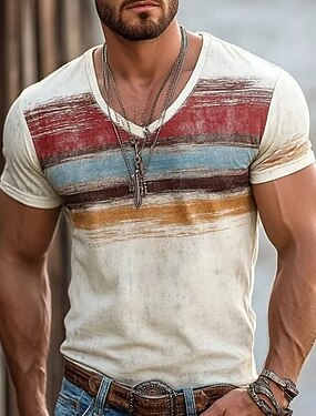 Мужская футболка в стиле ретро с потертым рисунком, разноцветными горизонтальными полосами, в винтажном стиле 70-х, с графическим принтом, облегающий крой, V-образный вырез, летняя повседневная