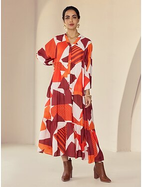 шифоновое геометрическое узорное платье с y-образным вырезом, повседневное макси-платье