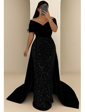 А-силуэт Футляр В пол Вечернее платье Бальное платье с верхней юбкой Торжественное платье Элегантный стиль Блестящая Маленькое черное платье С короткими рукавами С открытыми плечами